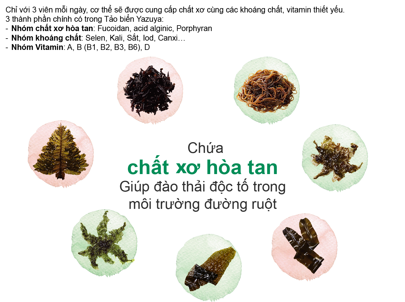 Tảo biển Yazuya được biết đến là sản phẩm có độ an toàn và độ cân bằng dinh dưỡng cao, được chiết xuất từ 7 loài tảo biển quý sinh sống tại những vùng biển có dòng hải lưu mạnh, chứa lượng khoáng chất cao.