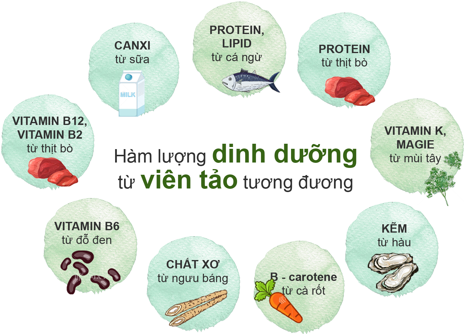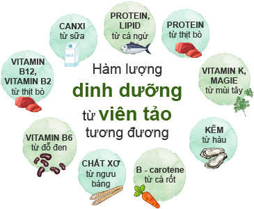 Tảo Spirulina chứa hàm lượng protein cao nhất trong các loại thực phẩm (gấp 3 lần thịt bò). Ngoài ra, Tảo Spirulina còn chứa nhiều loại vitamin và khoáng chất khác.